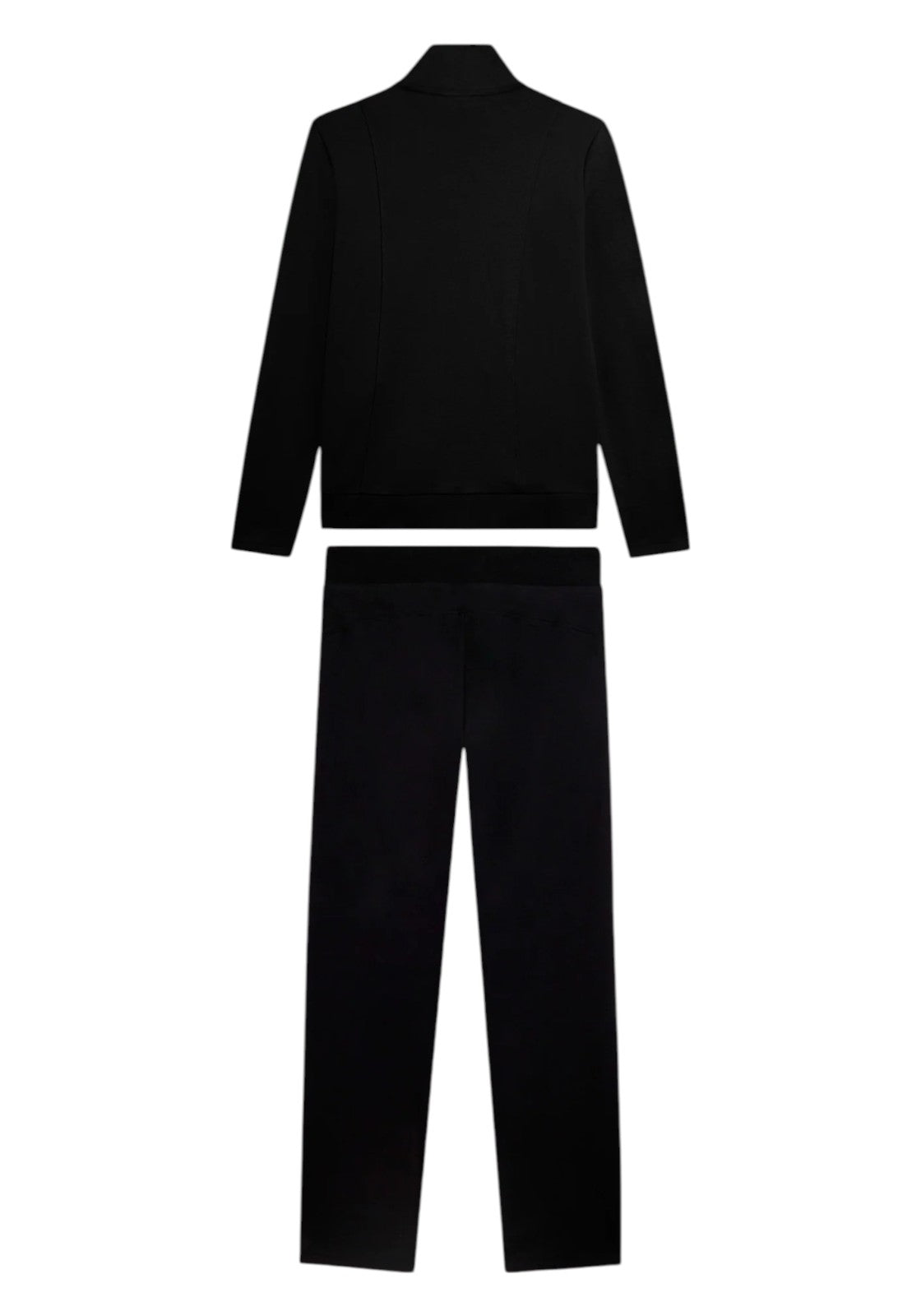 Questa tuta in interlock 100% cotone unisce eleganza e comodità. La felpa ha zip tono su tono, collo alto e maniche aderenti senza polsini, con fascia in costina al fondo. I pantaloni sono regular fit con coulisse e fondo dritto. Il logo FREDDY con strass dona un tocco brillante su cuore e fianco. Tasche anteriori interne sulla felpa.