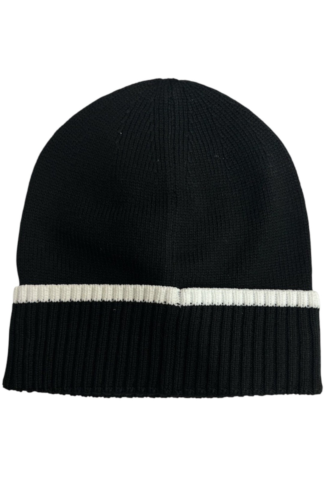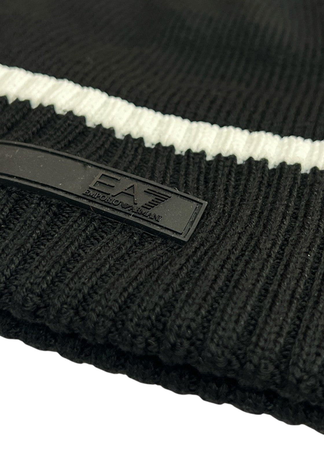 Berretto EA7 Emporio Armani in maglia a costine nera, con risvolto e banda bianca a contrasto. Patch logo in gomma sul davanti. Morbido e caldo, stile unisex perfetto per l’inverno.