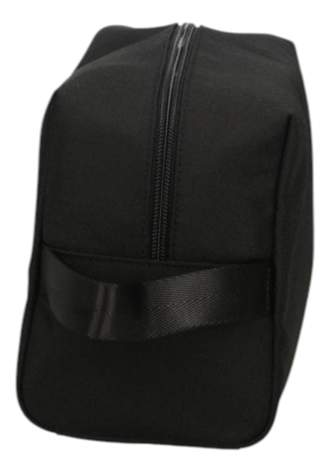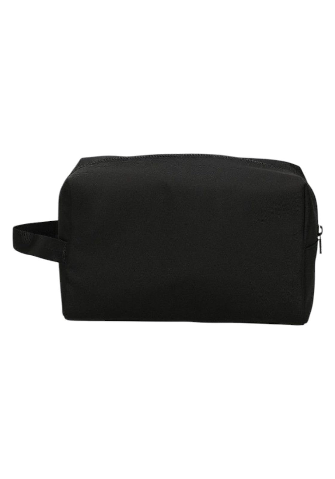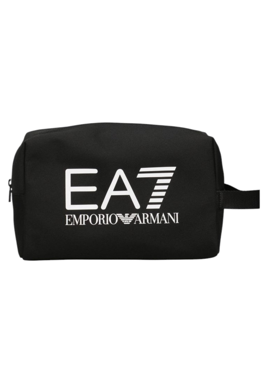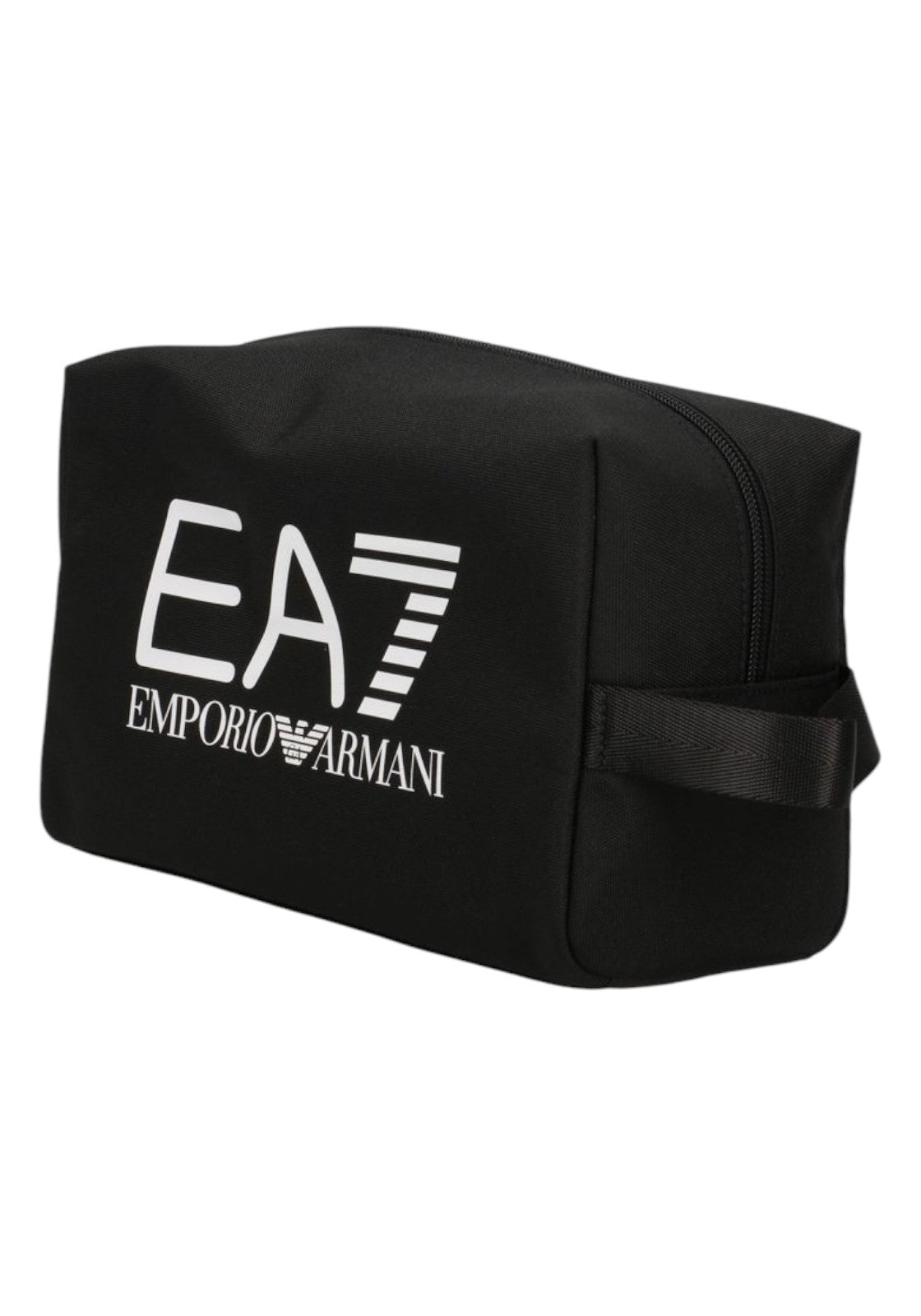 Beauty case/necessaire EA7 Emporio Armani in tessuto tecnico nero, maxi logo a contrasto, chiusura zip e manico laterale. Interno capiente, ideale per viaggio e palestra.