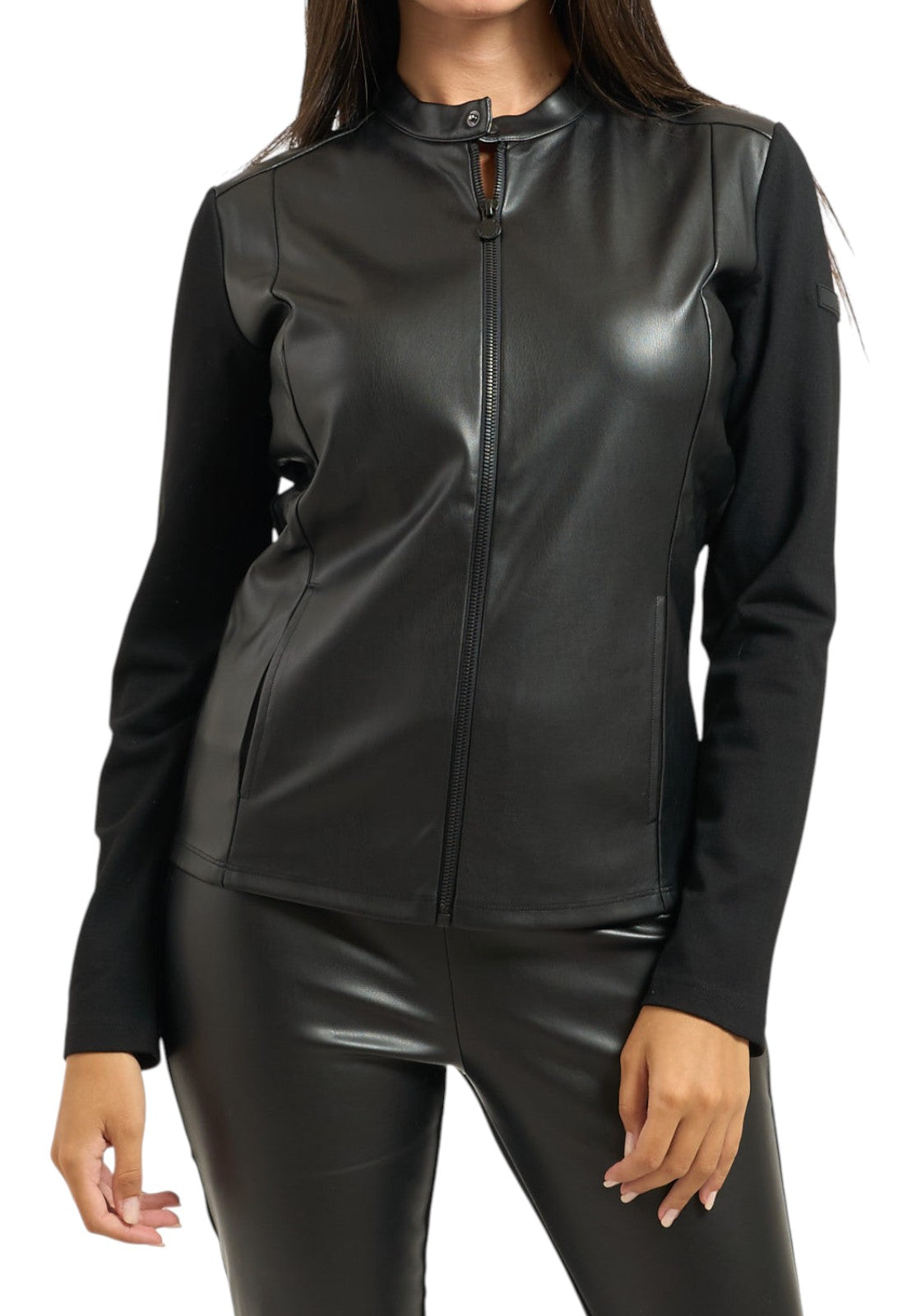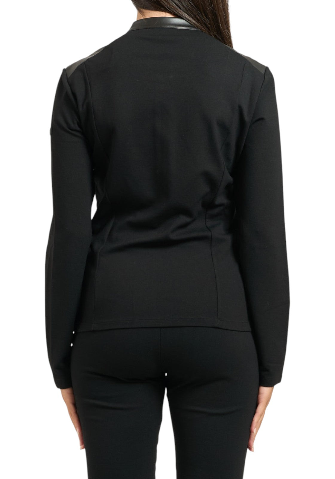 Felpa fullzip per donna di EA7 realizzata in misto viscosa stretch e in tessuto effetto pelle. Collo a listino con bottone, due tasche laterali, patch gommata in tono sulla manica sinistra.