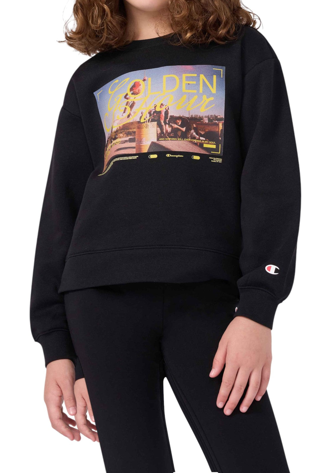 Tuta da bambina Champion 405282 in colore nero, composta da felpa e pantalone coordinati. Realizzata in tessuto morbido e confortevole, presenta vestibilità comoda e stampa. Ideale per la scuola, il tempo libero e le attività quotidiane con uno stile sportivo e pratico.