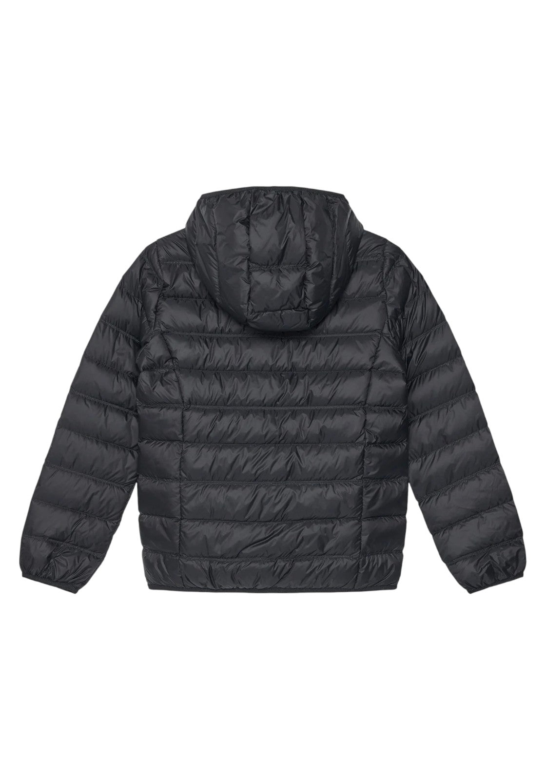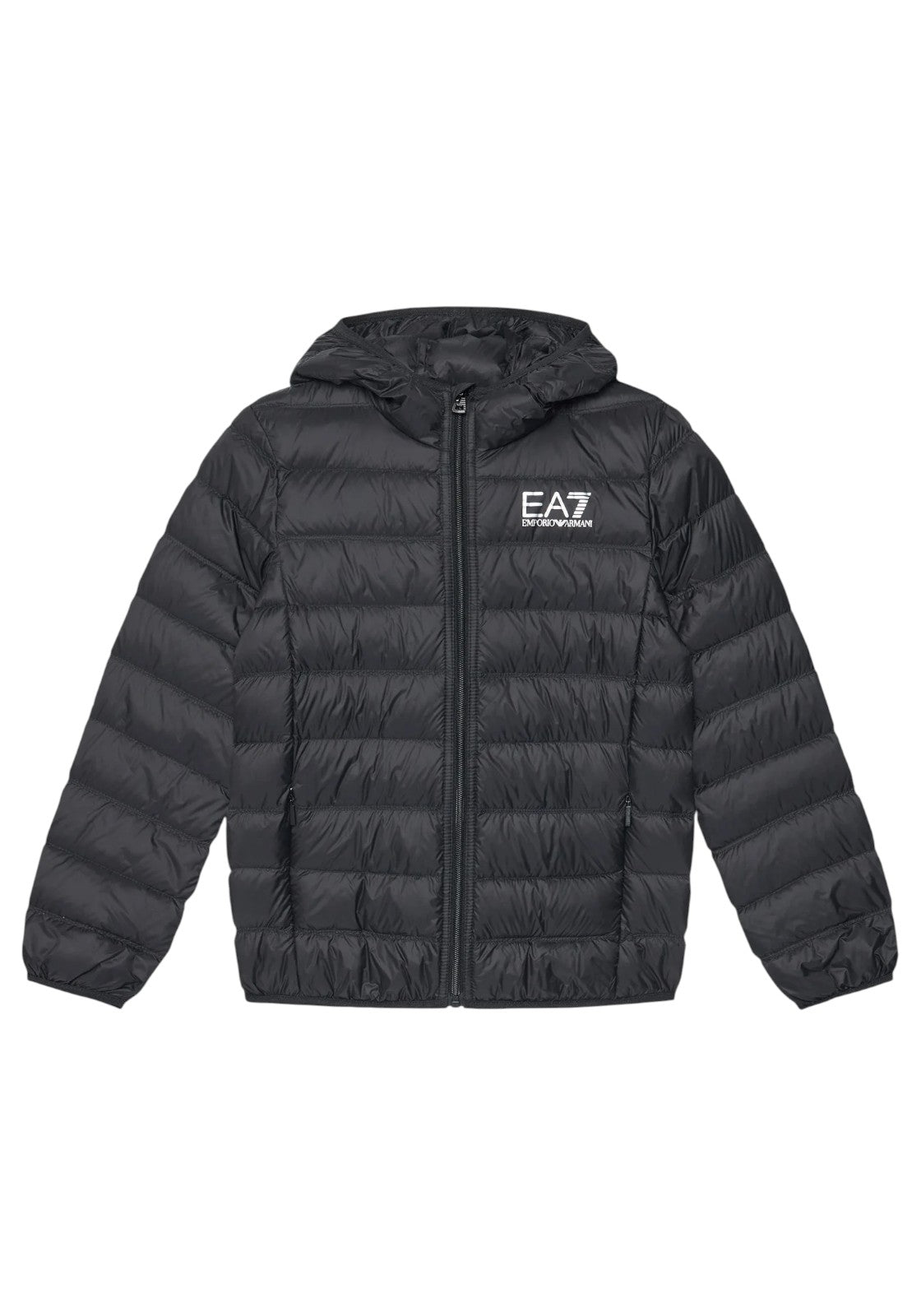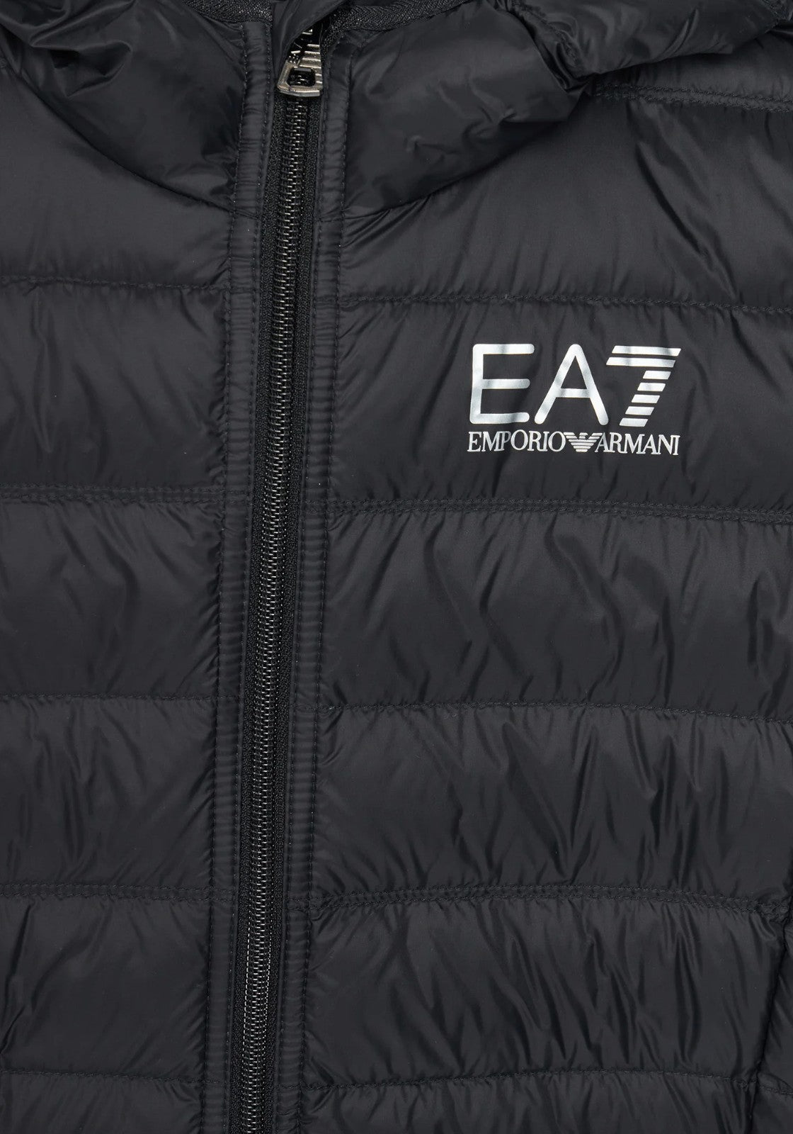 Piumino leggero EA7 Emporio Armani con cappuccio, trapuntatura orizzontale, zip integrale e tasche laterali; logo sul petto, polsi e fondo elasticizzati, caldo e comprimibile per l’uso quotidiano.