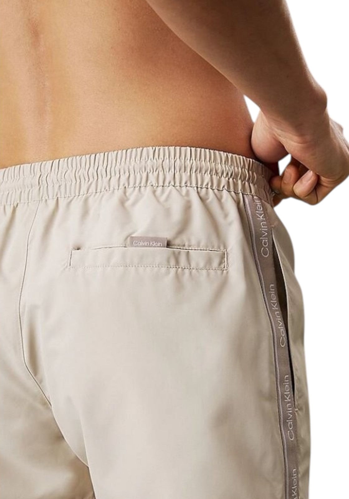 Short da bagno beige con dettagli a nastro Calvin Klein sulle cuciture laterali e tasca posteriore.