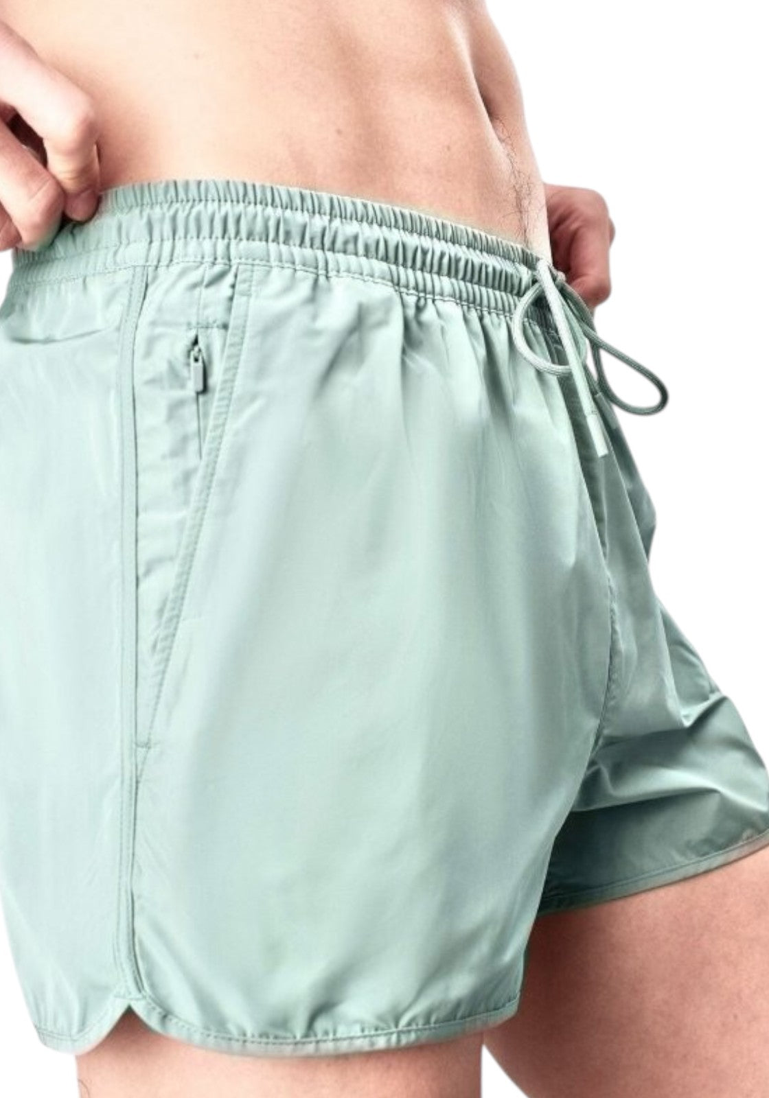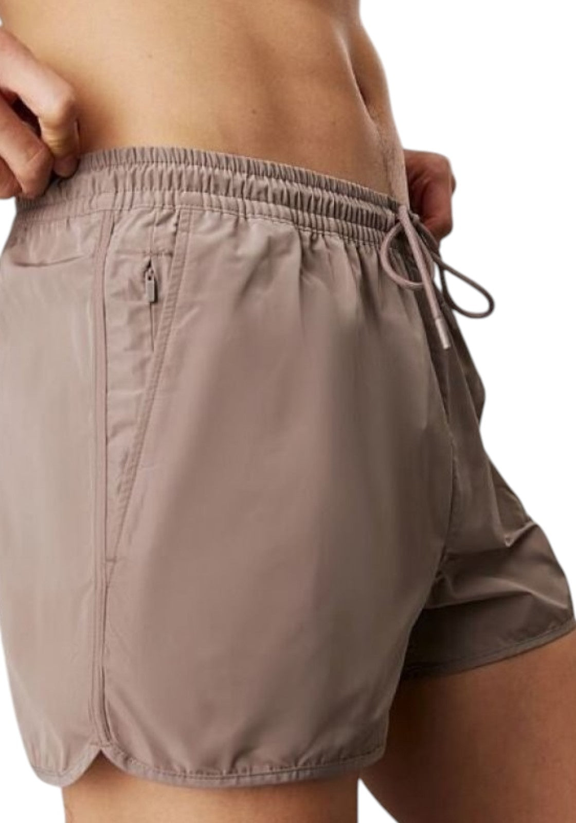 Costume da bagno corto color taupe con cintura elastica e cordino. Modello semplice con mini logo laterale e zip invisibile.