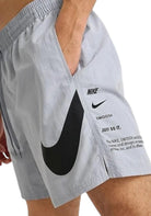 Costume da bagno uomo Nike in tessuto nero, caratterizzato da una grafica con maxi Swoosh bianco e stampa loghi laterale Nike, Just Do It e Swoosh. Vita elasticizzata con cordino regolabile per una vestibilità comoda. Stile sportivo e dinamico, ideale per l’estate.