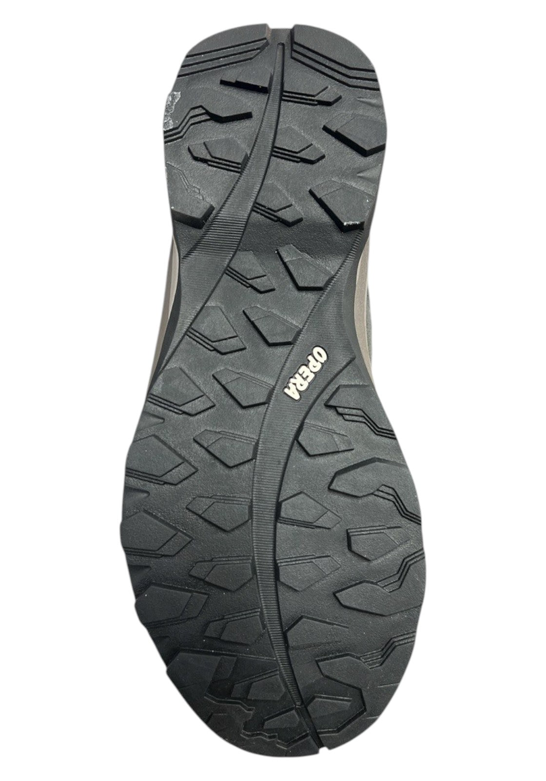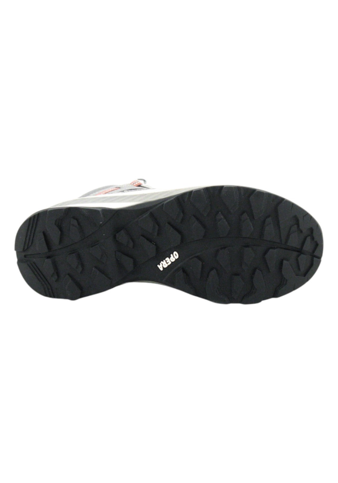 I lacci grigi fissano saldamente la scarpa, passando attraverso quattro occhielli metallici, un passante e un gancio. La suola da trekking Olang Opera con tasselli è spessa circa 3,5 cm al tallone, offrendo un'eccellente ammortizzazione e trazione su