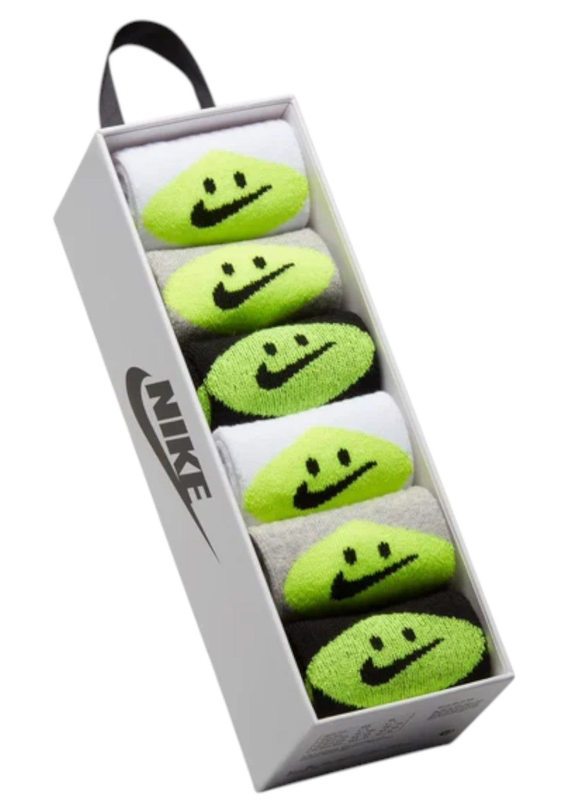 Set calze multicolor composto da sei paia di calze in spugna, bianche grigie e nere, decorate con smile e iconico swoosh sulla parte anteriore.
