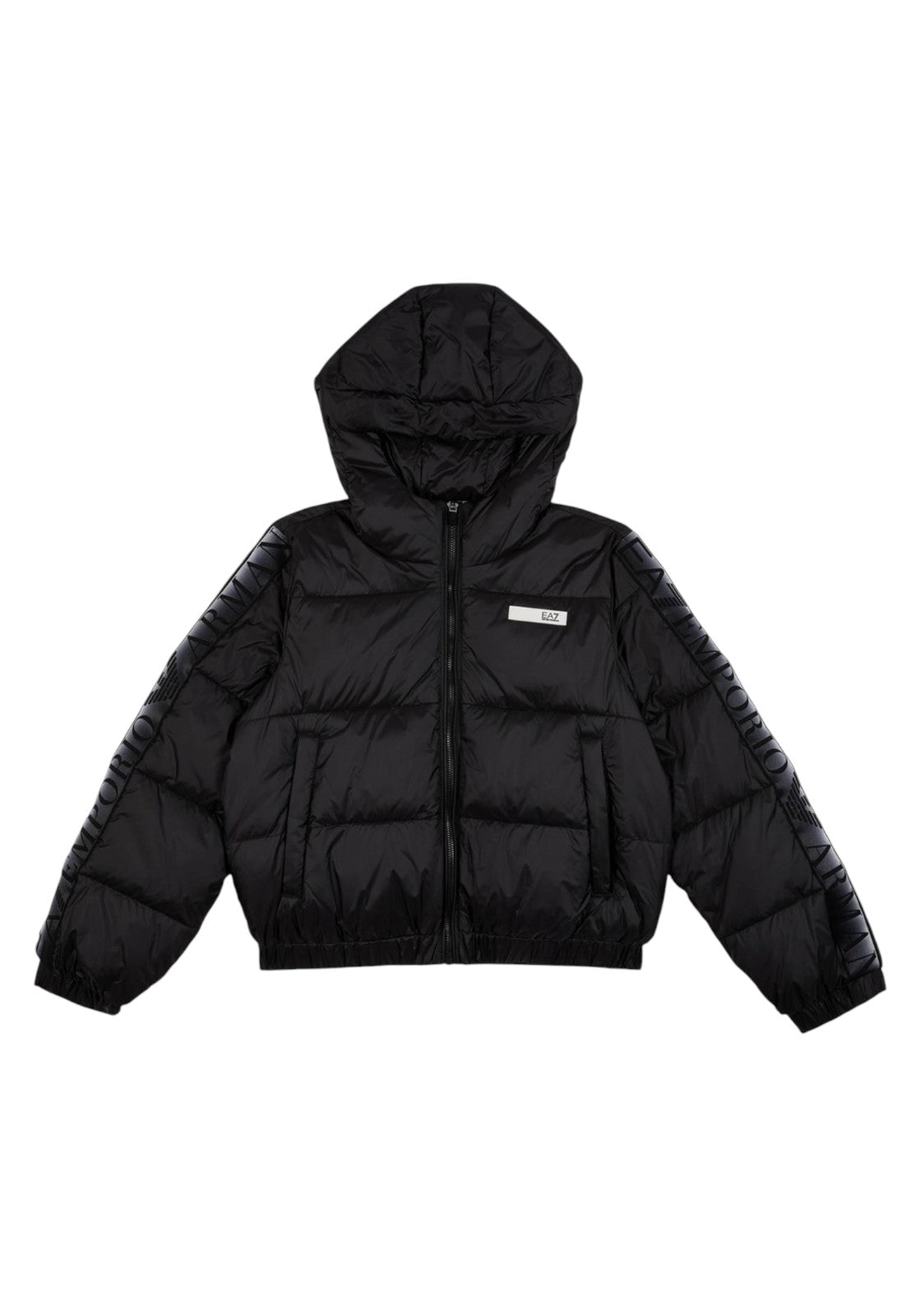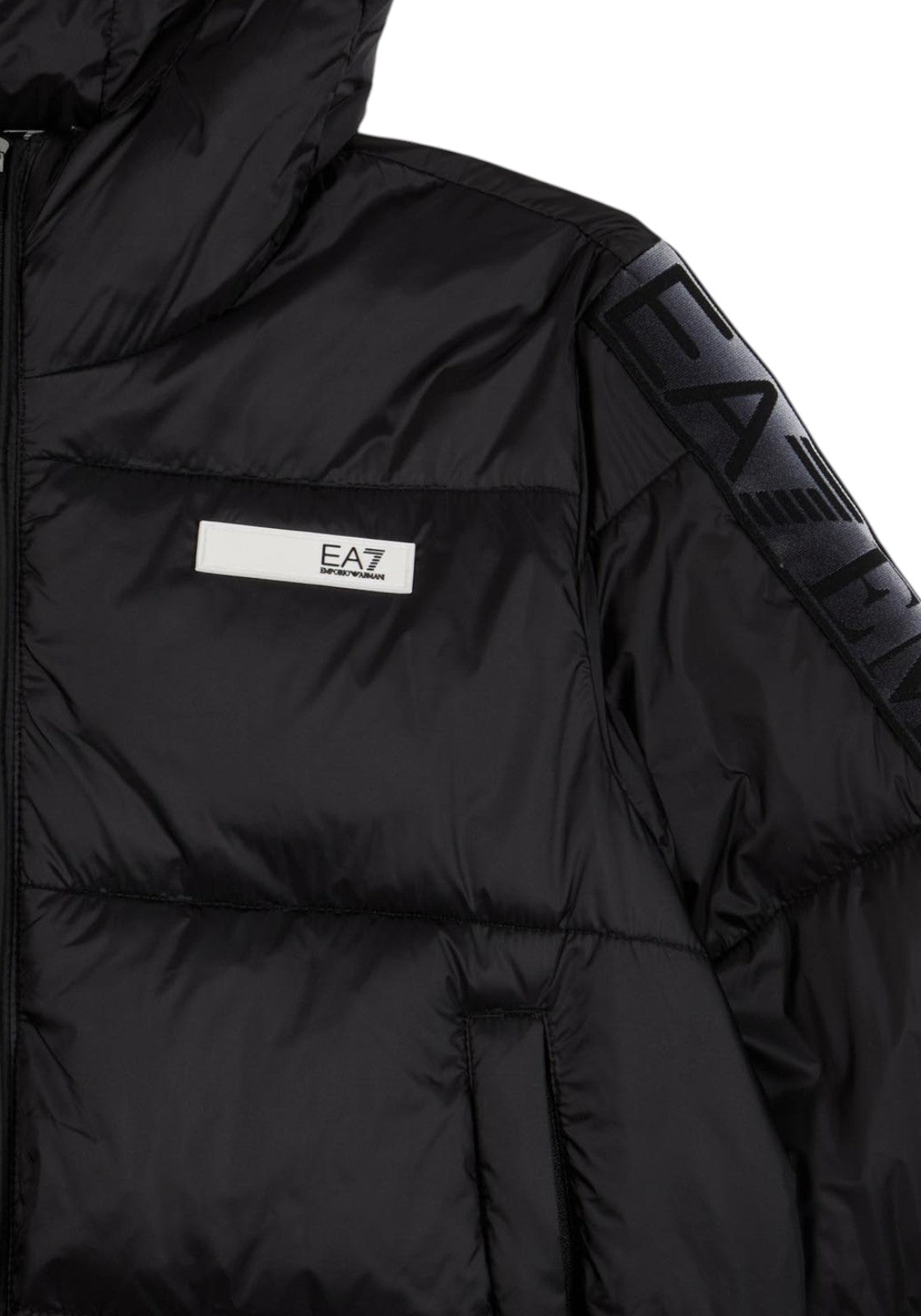 Piumino con cappuccio EA7 Emporio Armani in tessuto lucido antivento, con imbottitura calda e leggera. Chiusura full-zip, tasche con zip, polsini e fondo elasticizzati. Patch EA7 sul petto e logo sulle maniche; vestibilità regular ideale per l’inverno.
