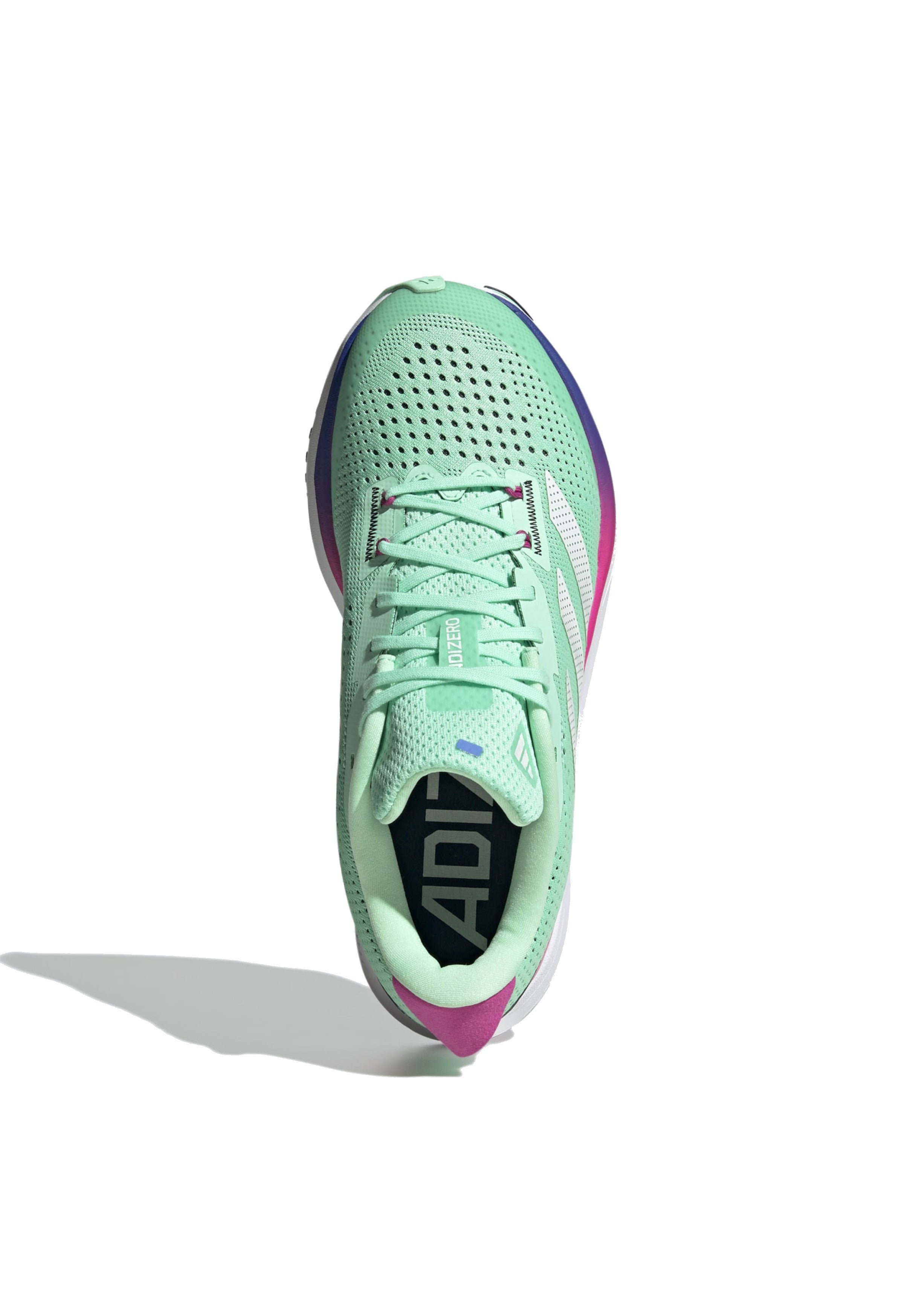 La tomaia tecnica e veloce presenta dettagli in morbidissimo mesh tecnico in punti chiave. Il tallone e la linguetta imbottiti migliorano il comfort e la calzata, mentre la scritta ADIZERO sul tallone completa il look. La suola integrale in gomma assicura il massimo grip su qualsiasi superficie, in ogni condizione. La tomaia è composta per almeno il 50% da materiali riciclati.