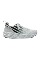Sneakers EA7 Emporio Armani da uomo in tessuto tecnico bianco con dettagli neri laterali a contrasto e suola geometrica in gomma. Design sportivo e contemporaneo, ideali per uno stile urbano e dinamico.