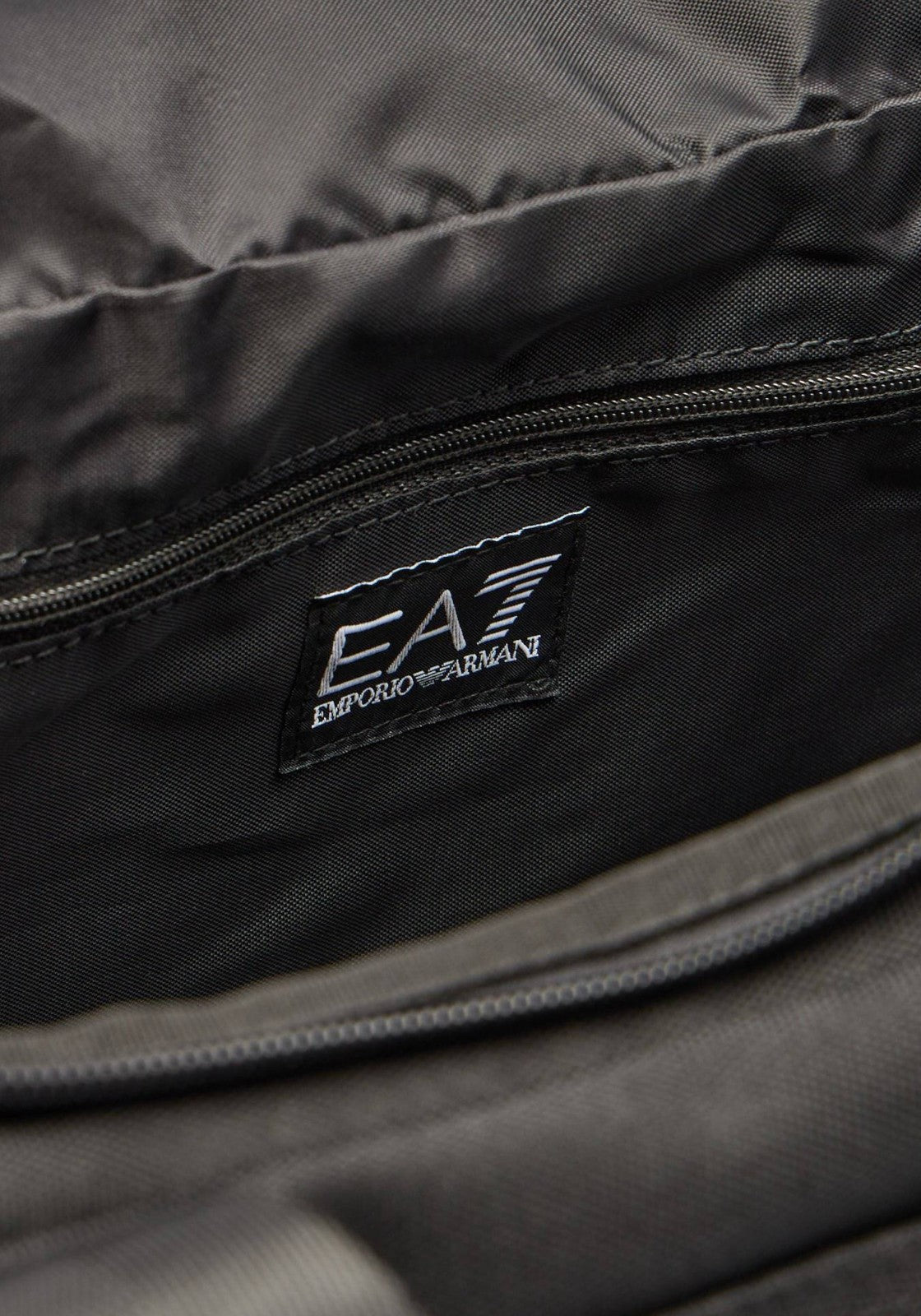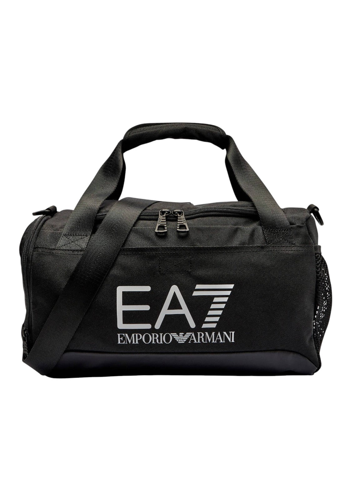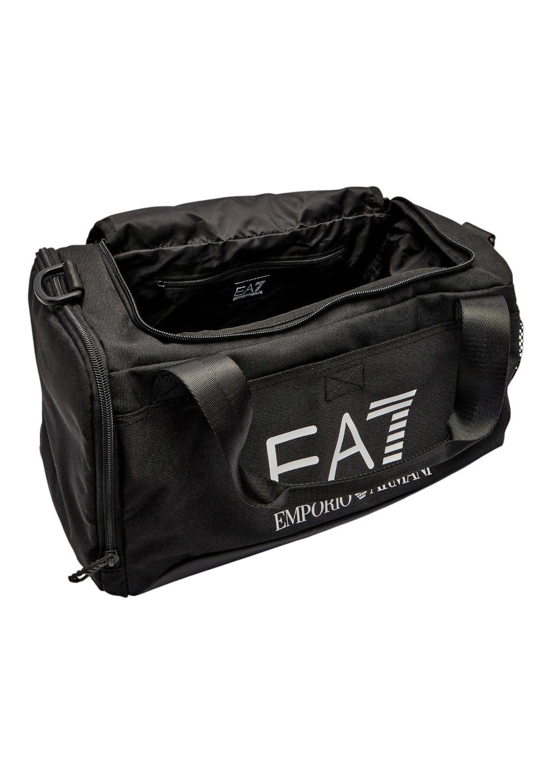 Borsone EA7 Emporio Armani in tessuto tecnico nero con maxi logo frontale. Doppia zip, tasca interna con zip, tasche laterali (una in rete), fondo rinforzato, manici e tracolla regolabile. Perfetto per palestra e viaggio.