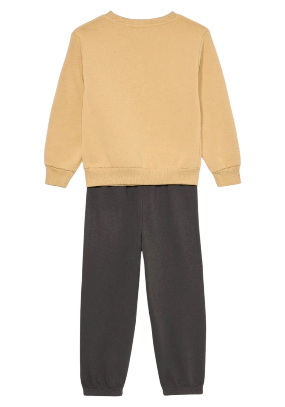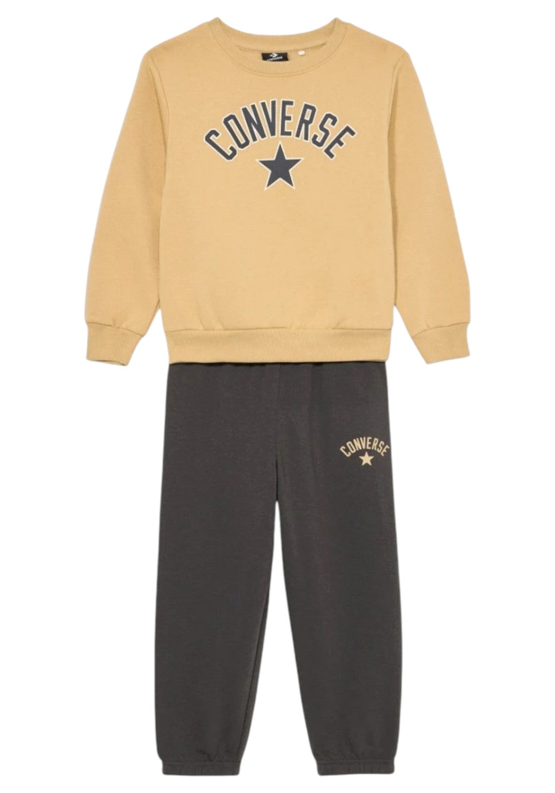 CONVERSE Tuta beige e grigia da bambino. Realizzata in morbido cotone felpato, combina una felpa color beige chiaro con pantaloni grigio antracite, creando un contrasto moderno e versatile. La felpa girocollo presenta maniche lunghe, polsini e fondo elasticizzati, impreziosita dalla stampa frontale con la scritta 'Converse' ad arco e la classica stella iconica al centro. I pantaloni jogger hanno vita e caviglie elasticizzate per un fit comodo e funzionale, con il logo Converse stampato sulla gamba sinistra.