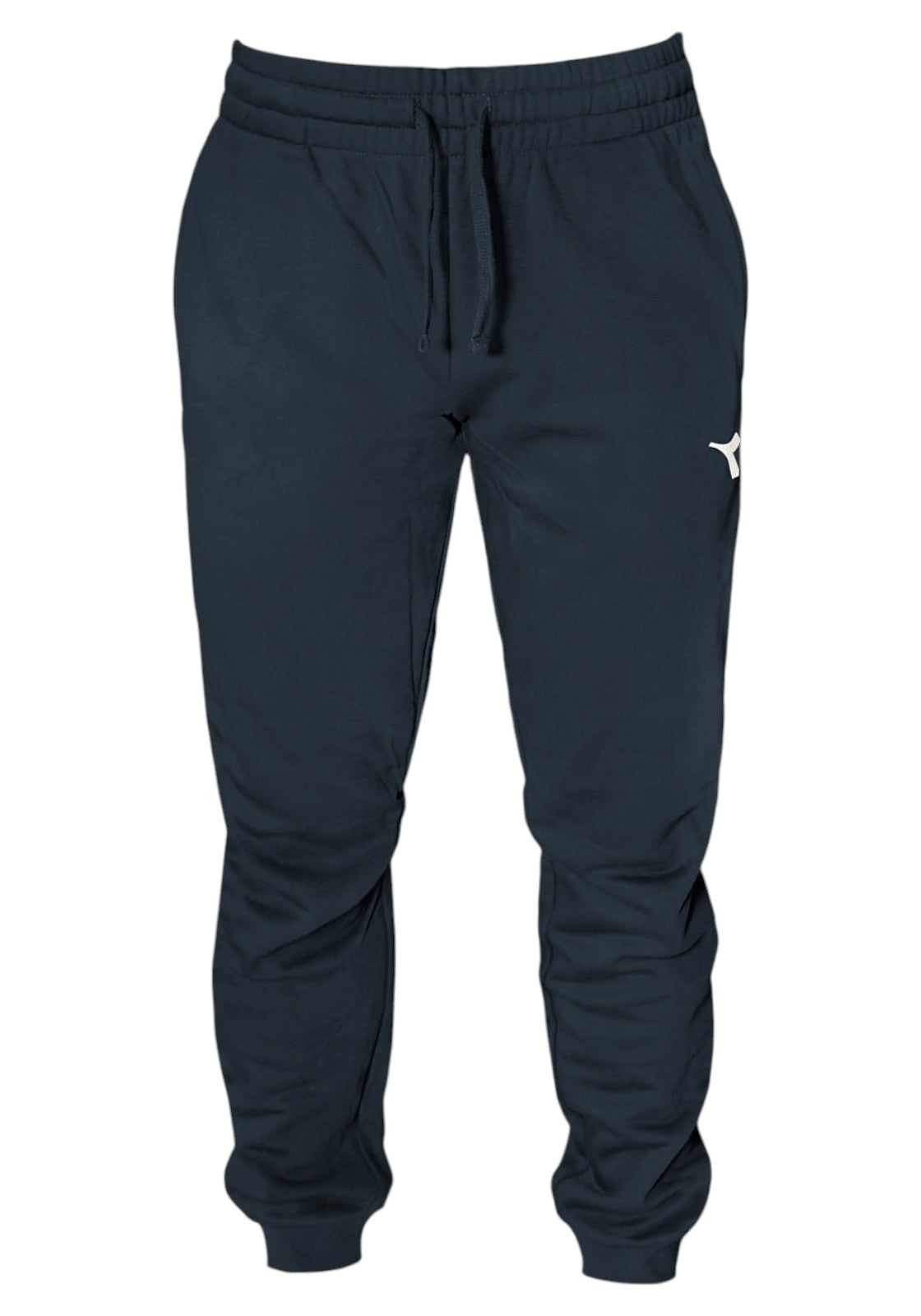 Pantaloni neri con vita elasticizzata e coulisse, fondo a costine e logo stampato: comoda per allenamento e tempo libero.